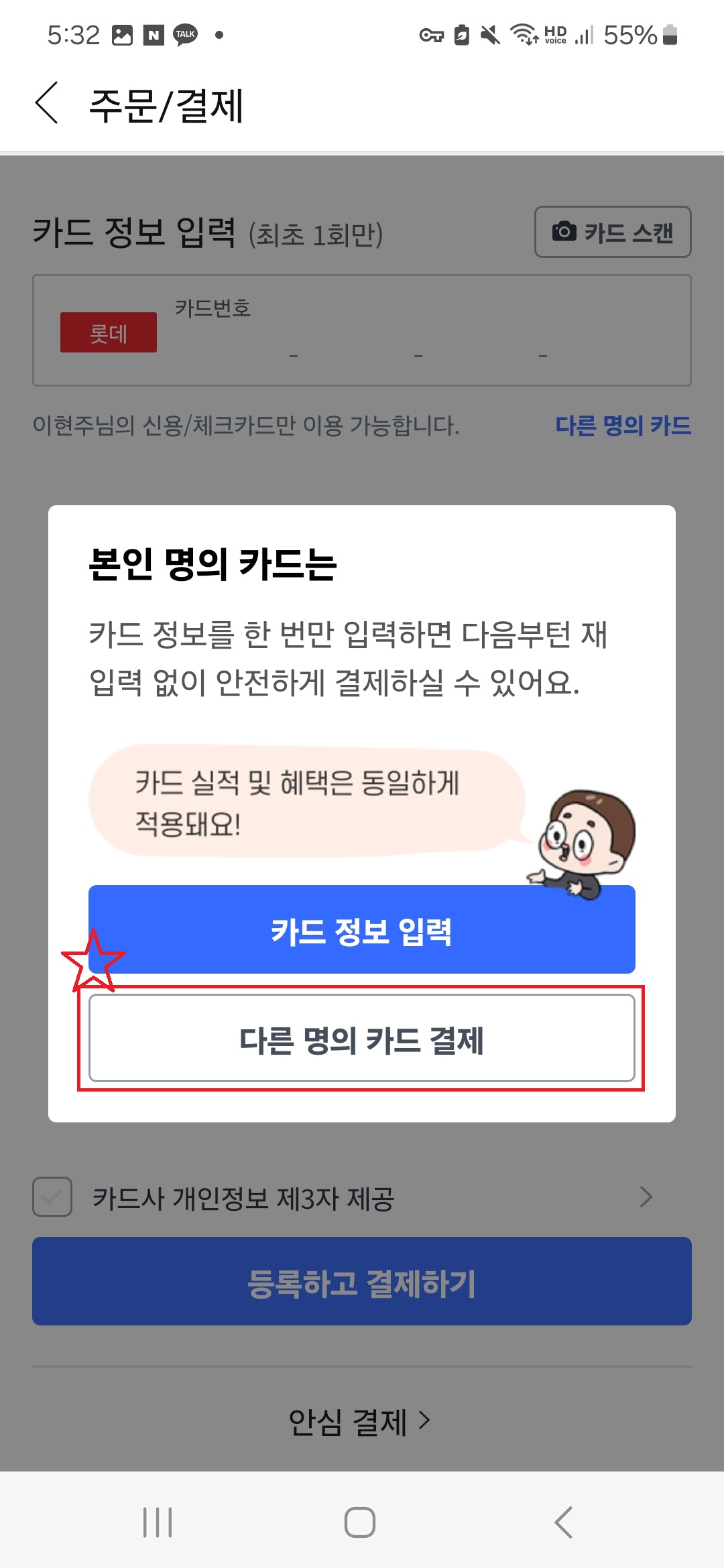 👉️카드번호 입력하는 칸 아래에 다른 명의 카드 눌러주세요